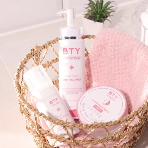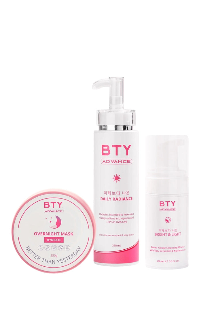 The set includes BTY InstaGlow (Lotion), BTY Overnight Mask (cream), and BTY Sunstick (sunscreen).
