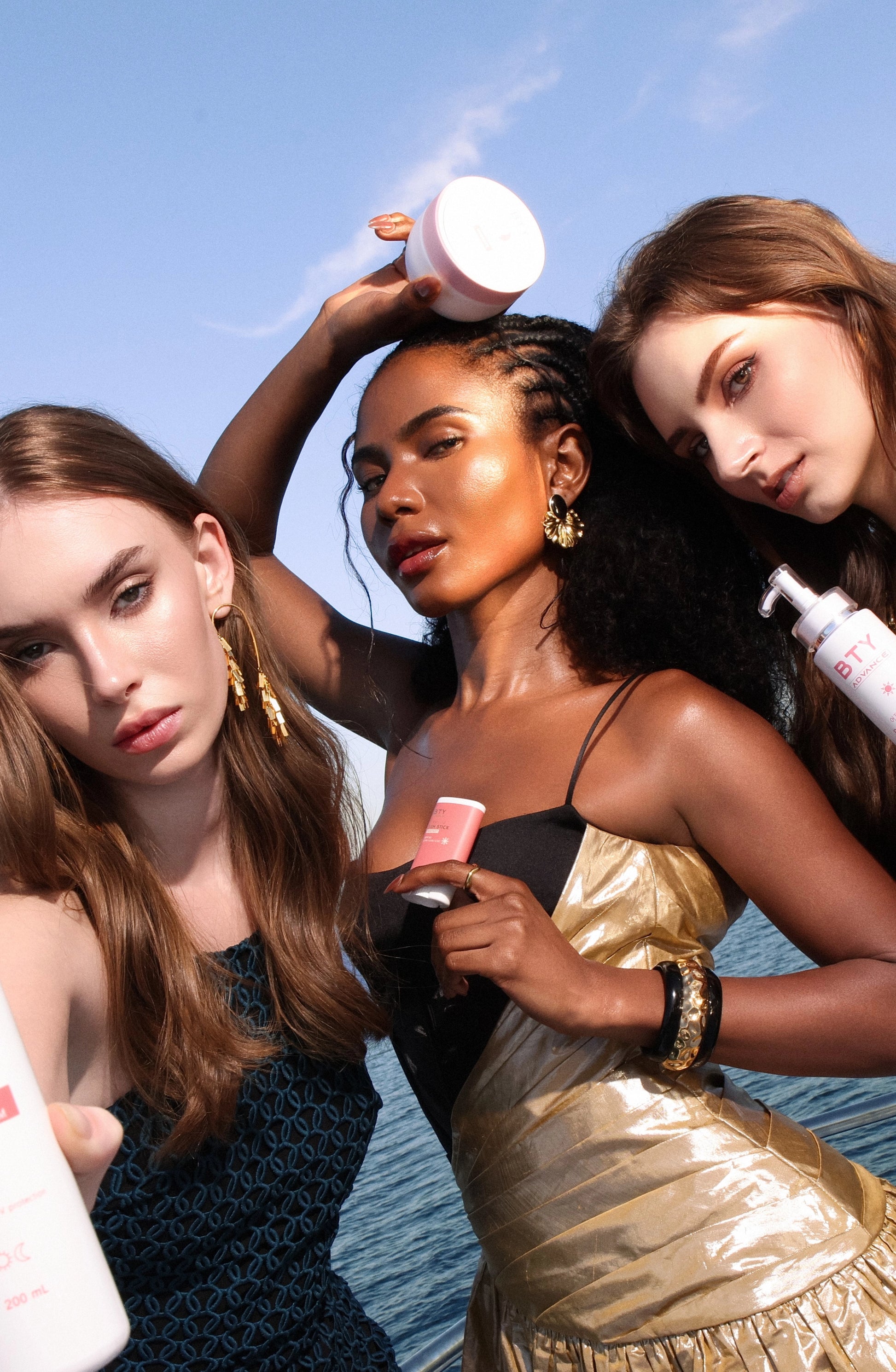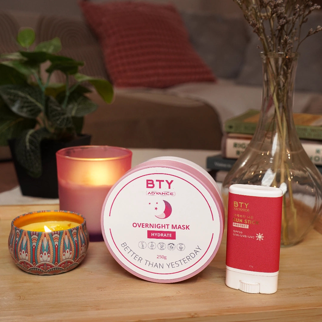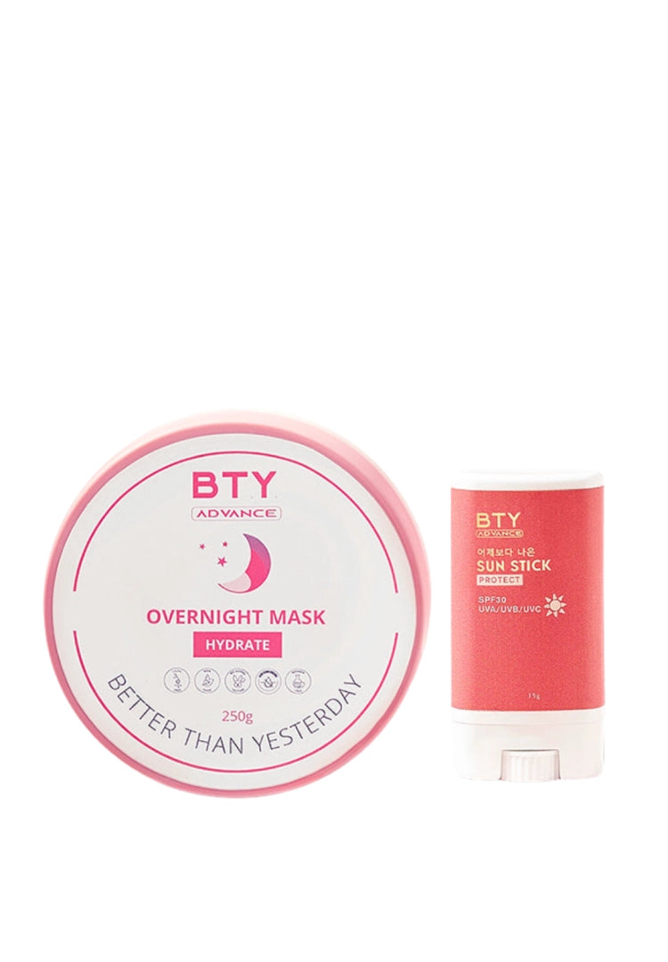 The set includes BTY InstaGlow (Lotion), BTY Overnight Mask (cream), and BTY Sunstick (sunscreen).